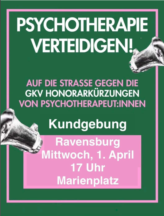 Am Mittwoch, den 1. April 2026 findet um 17.00 Uhr in Ravensburg am Marienplatz eine Kundgebung gegen den Beschluss zur Honorarkürzung von Psychotherapeut:innen durch die Gesetzlichen